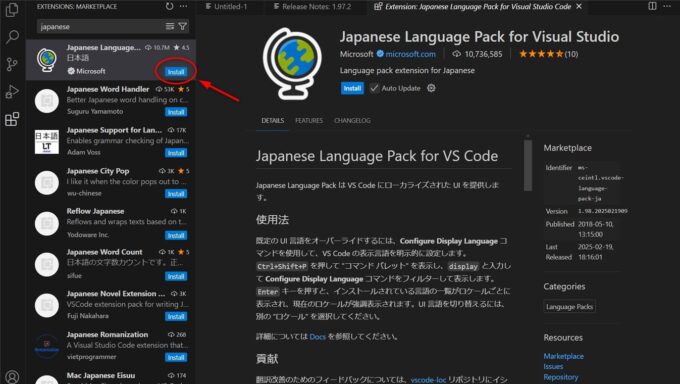 左の拡張機能アイコンを選択して検索欄に「Japanese」といれると「Japanese Language Pack for Visual Studio」と出てくるのでインストールしましょう。「Visual Studio Code」を再起動すると日本語になっているはずです。